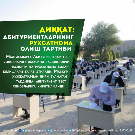 Ўзбекистон мусулмонлари идораси тасарруфидаги ўрта махсус ислом таълим муассасаларига ҳужжат топширган абитуриентлар Давлат тест маркази томонидан ўтказиладиган тест синовларига кириш РУХСАТНОМАСИни Диний идоранинг qabul.muslim.uz сайти ва @qabulmuslimuz_bot ёки @qabulmuslimuz2_bot телеграм ботлари орқали юклаб олишлари мумкин. Бунинг учун абитуриент паспорт серияси ва рақамини тегишли жойга ёзади ва рухсатномани олади.