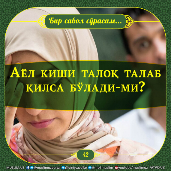 — Аёл киши қачон ва қандай ҳолатда эридан талоқ сўраши мумкин? Ўзини ўзи ҳам талоқ қилса бўлади, деб эшитдим. Шунга аниқлик киритиб берсангиз.