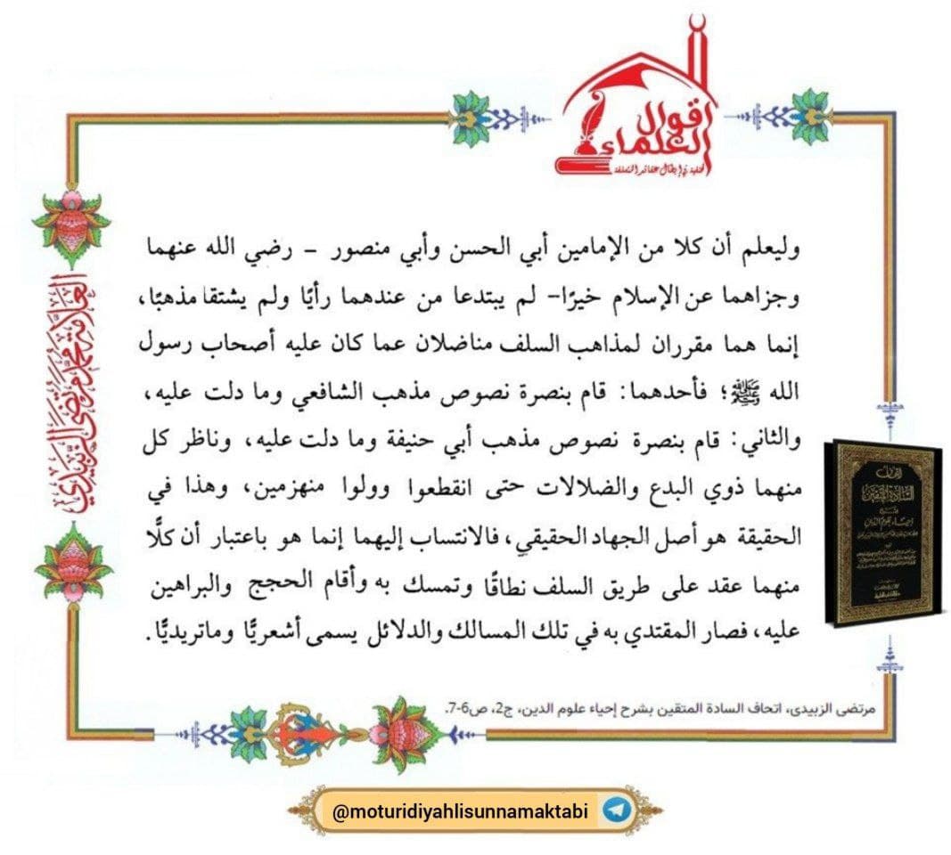 Albatta, bu zotlar salafi solihlar mazhabini qaror toptirdilar va Rasululloh sollallohu alayhi vasallamning sahobalarining yo‘liga muvofiq keldilar. U zotlardan biri Shofe'iy mazhabining va xujjatlarining nusratida turgan bo‘lsalar, boshqalari Hanafiy mazhabining va xujjatlarining nusratida qoim turdilar. U zotlarning har ikkalalari bid'at va zalolat ahliga qarshi munozara qildilar va ularni yer bilan yakson qilib, g‘alaba qozondilar. Darhaqiqat, bu haqiqiy jihodning aslidir! Odamlarning o‘zlarini u zotlarga nisbat berishiga kelsak, u zotlarning har biri salafi solihlar yo‘liga bir arqonni bog‘ladilar, uni mahkam tutdilar va unga xujjat va dalillarni keltirdilar. Natijada ushbu yo‘lda yurgan va dalillarga ergashgan kishiga «Ash'ariy» va «Moturidiy» nomi ishlatiladigan bo‘ldi».