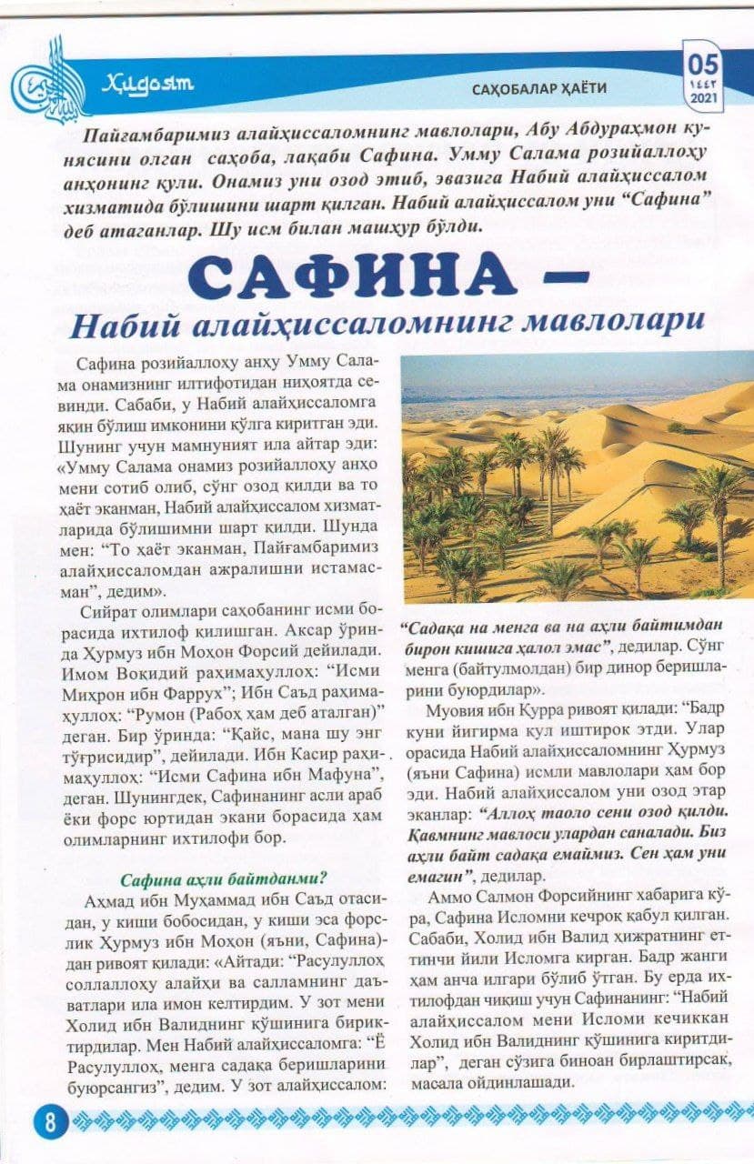 Ahmad ibn Muhammad ibn Sa'd otasidan, u kishi bobosidan, u kishi esa forslik Hurmuz ibn Mohon (ya'ni, Safina)dan rivoyat qiladi: «Aytadi: “Rasululloh sollallohu alayhi va sallamning da'vatlari ila imon keltirdim. Ular meni Xolid ibn Validning qo‘shiniga biriktirdilar. Keyin men Nabiy alayhissalomga: “Yo Rasululloh, menga sadaqa berishlarini buyursangiz”, dedim. U zot alayhissalom: “Sadaqa na menga va na ahli baytimdan biron kishiga halol emas”, dedilar. So‘ng menga (baytul moldan) bir dinor berishlarini buyurdilar».