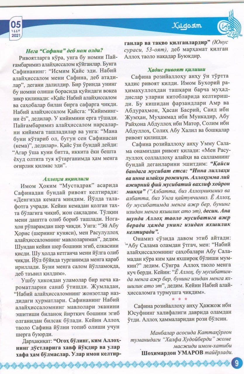 Safina roziyallohu anhu Ummu Salama onamizdan rivoyat qiladi: «Men Rasululloh sollallohu alayhi va sallamning bunday deganlarini eshitdim: “Qaysi bandaga musibat yetsa:“Inna lillahi va inna ilayhi roji'un. Allohumma ajirni fi musibatina vaxlif xoyron minha”, (“Albatta, biz Allohnikimiz va albatta, biz Unga qaytuvchimiz. Yo Alloh, bu musibatimda menga ajr ber, buning izidan menga yaxshilik ato et), desin. Ana shunda Alloh taolo musibatiga ajr beradi hamda uning izidan yaxshilik keltiradi”. Onamiz so‘zida davom etib aytadi: “Abu Salama olamdan o‘tgach, men: “Nabiy alayhissalomning sahobalari Abu Salamadan ko‘ra kim ham yaxshiroq bo‘lishi mumkin?” dedim. So‘ngra Alloh taolo menga kuch berdi. Keyin: “Yo Alloh, bu musibatimda menga ajr ber, buning izidan menga yaxshilik ato et”, dedim. Keyin Nabiy alayhissalomga turmushga chiqdim».