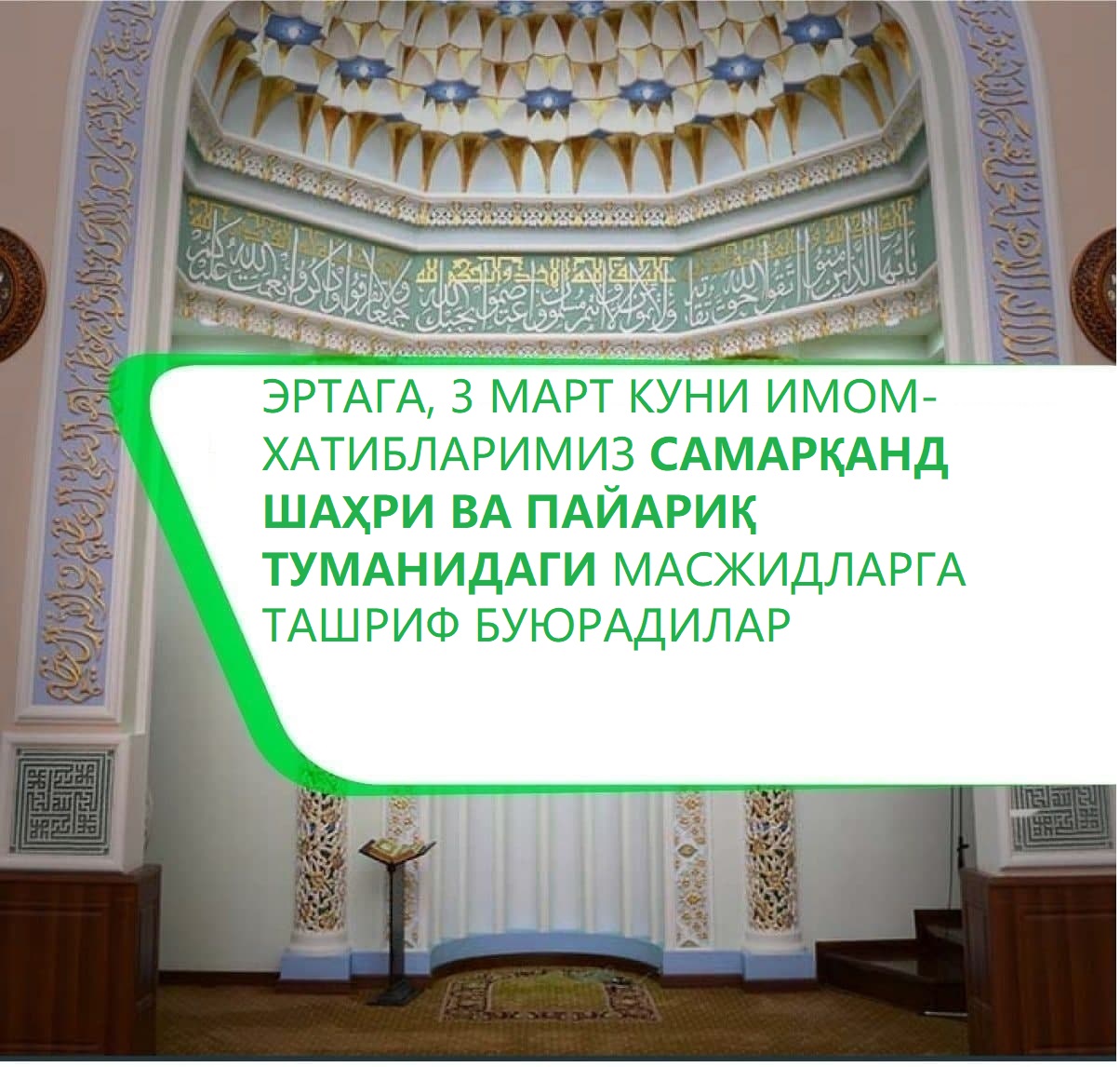 ERTAGA, 3 MART KUNI IMOM-XATIBLARIMIZ SAMARQAND SHAHRI VA PAYARIQ TUMANIDAGI MASJIDLARGA TASHRIF BUYURADILAR