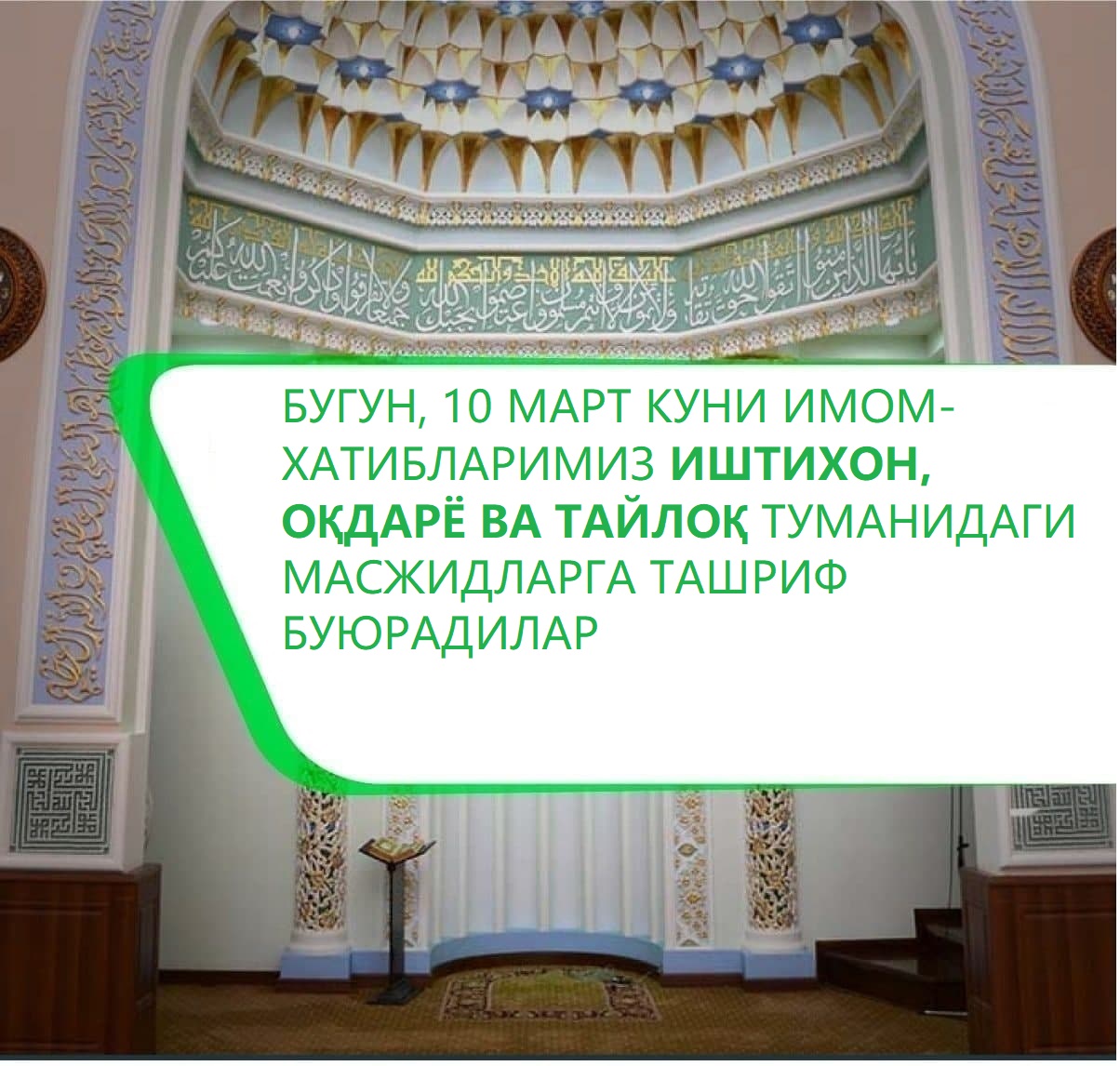 BUGUN, 10 MART KUNI IMOM-XATIBLARIMIZ ISHTIXON, OQDARYO VA TAYLOQ TUMANIDAGI MASJIDLARGA TASHRIF BUYURADILAR
