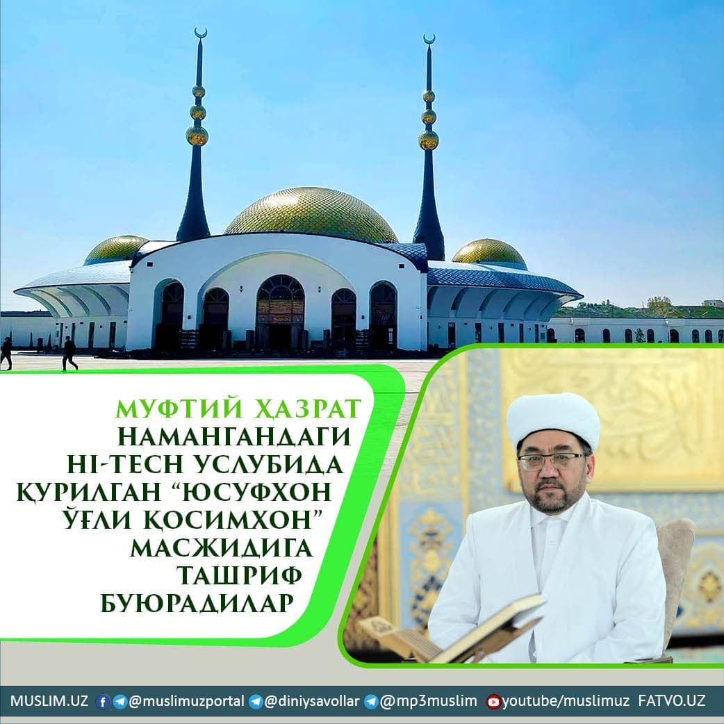 Muftiy hazrat Namangandagi Hi-Tech uslubida qurilgan “Yusufxon o‘g‘li Qosimxon” masjidiga tashrif buyuradilar