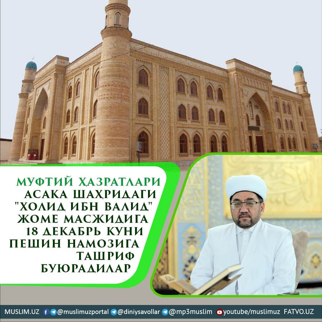 Ertaga, 18 dekabr kuni muftiy Nuriddin domla hazratlari Andijon viloyati Asaka shahridagi "Xolid ibn Valid" jome masjidida peshin namozini ado etib, mav'iza qilib beradilar.