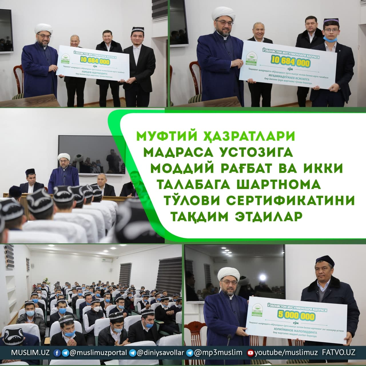 Muftiy hazratlari madrasa ustoziga moddiy rag‘bat va ikki talabaga shartnoma to‘lovi sertifikatini taqdim etdilar