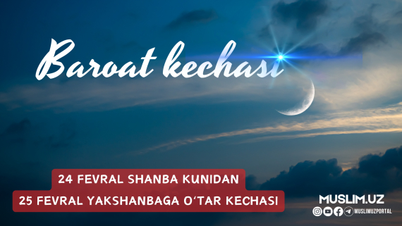 Eslatma! Bu yilgi baroat kechasi 24 fevral shanba kunidan 25 fevral yakshanbaga o‘tar kechasiga to‘g‘ri kelmoqda, inshaALLOH.